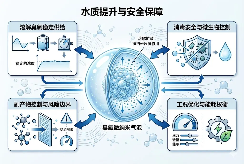 围绕饮用水/再生水的消毒安全与水质提升,聚焦 O₃-MNBs 的高效传质、残余活性与副产物风险边界,构建可用于工程放大的评价体系。