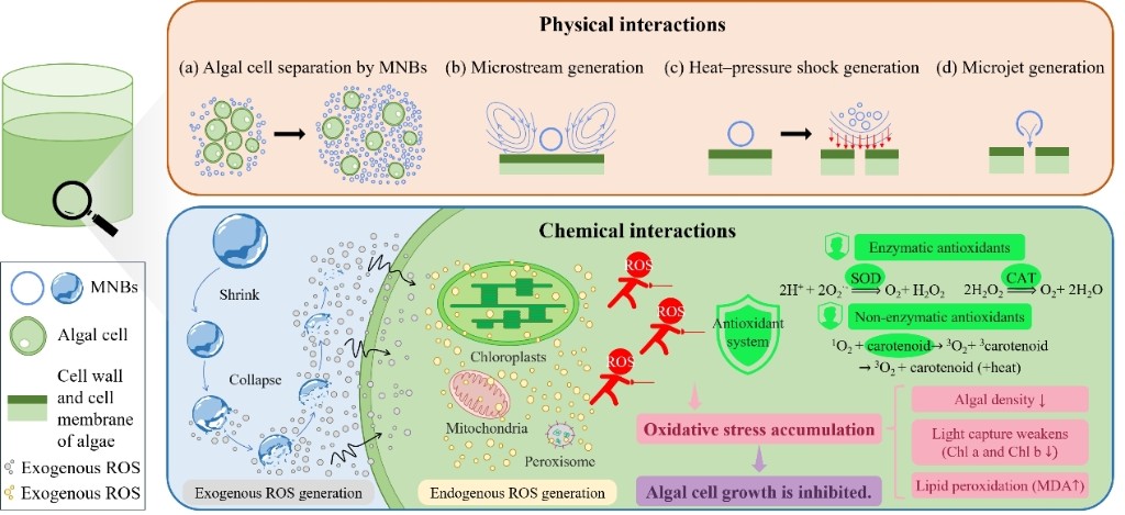 基于加压溶气释气法生成的高密度 MNBs 进入水体后可增强细胞-气泡接触,气泡溃灭产生微流、压力波、微射流与 ROS,对藻细胞形成物理-化学协同作用。SEM 结果显示细胞表面发生明显收缩、破裂及碎片化;同时 ·OH、H2O2、·O2− 诱导氧化胁迫,导致 SOD、CAT、类胡萝卜素、MDA 分别增加 88%、113%、11%、67%,并使叶绿素 a、b 分别下降 19% 与 45%,最终抑制藻细胞持续生长。